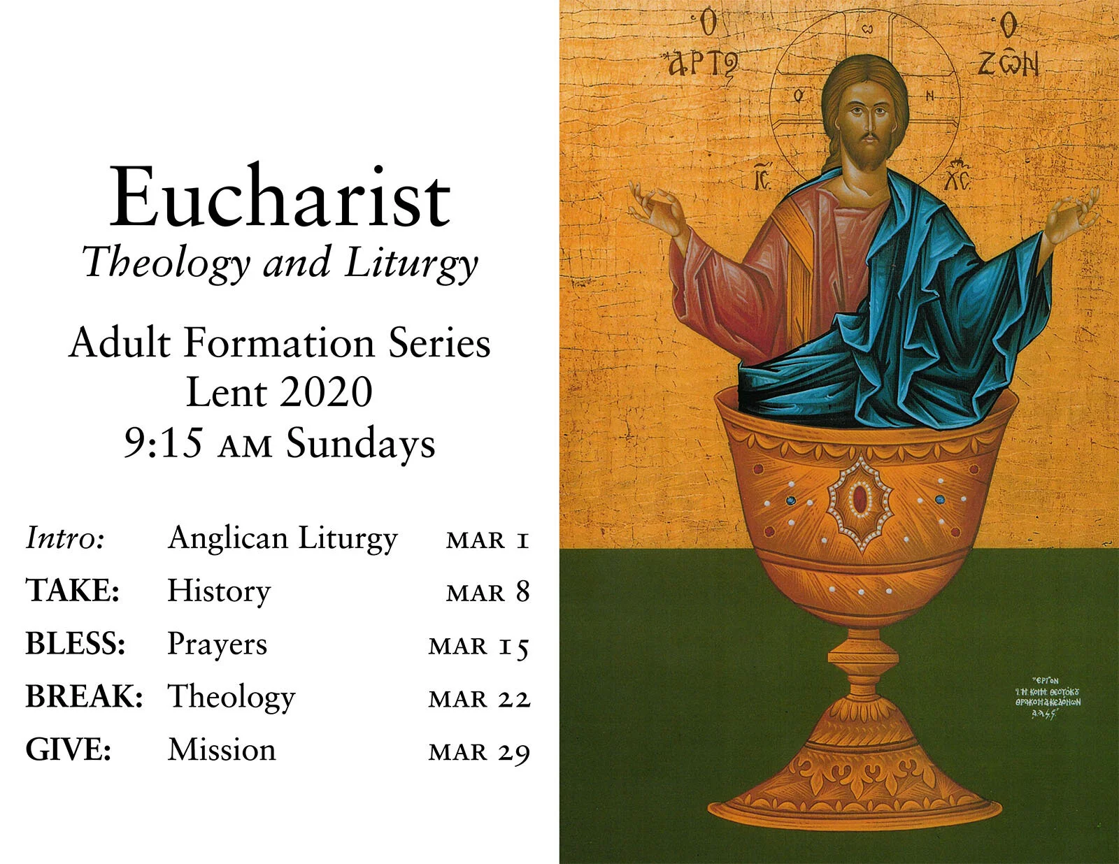 Lent Formation Series: The Eucharist ONLINE Sunday, March 15, 2020 9:15 AM 10:15 AM Google Calendar ICS OFFERED ONLINE: Every Sunday at 9:15 am during Lent (March 2020) our Adult Formation will be looking at the Theology and Practice of the Eucharist. Please join us any time. View fullsize